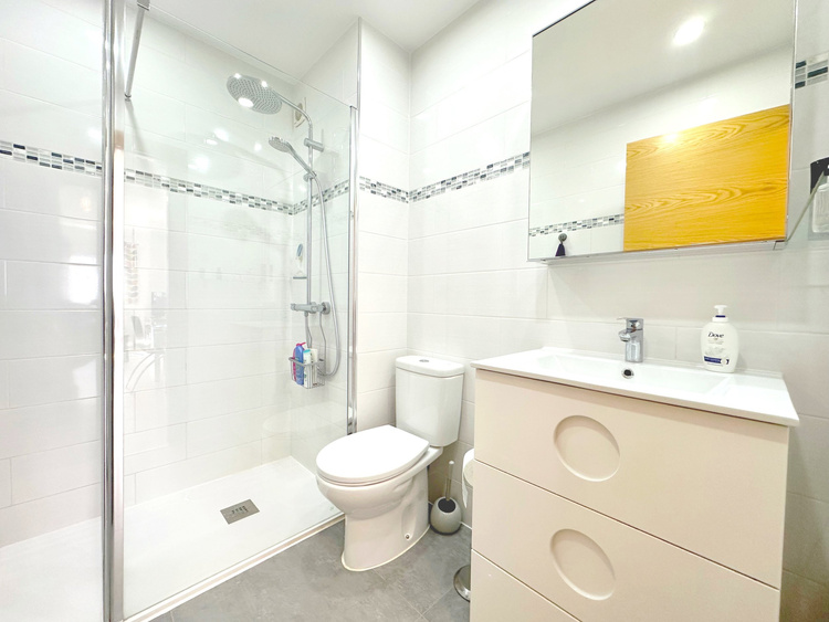 Tussen de 2 slaapkamers ligt de gezamenlijke badkamer. Deze is volledig gerenoveerd met nieuw sanitair en een instapdouche.