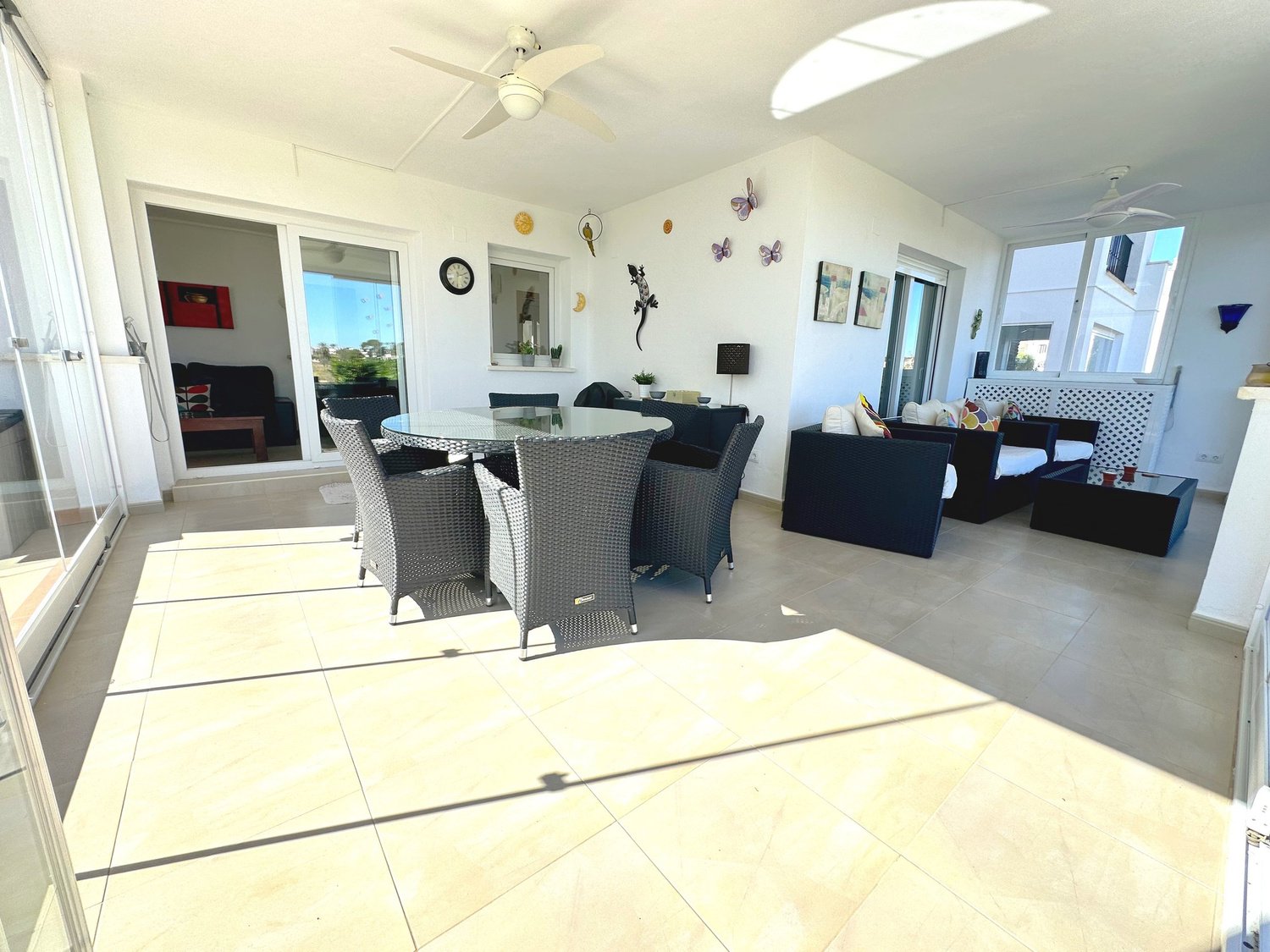 De ruime serre met glasgordijnen en panoramisch uitzicht op de golfbaan en de bergen is een absoluut hoogtepunt van deze woning. De glasgordijnen kunnen eenvoudig geopend worden om de ruimte te voorzien van frisse lucht en zonlicht.